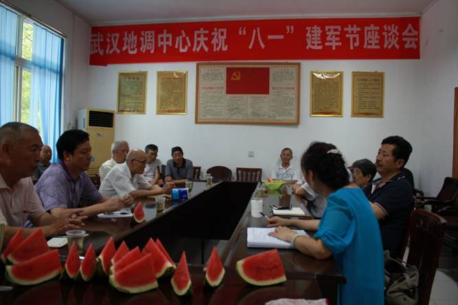 2015年7月31日,为庆祝中国人民解放军建军88周年,中国地质调查局武汉地质调查中心在宜昌基地举行“八一”建军节座谈会。武汉中心主任助理、宜昌基地处处长曾冶红主持座谈会。党委办公室主任戴明元专程从武汉赶到宜昌出席座谈会,并代表中心领导及在汉职工对复转军人表达敬意和慰问。