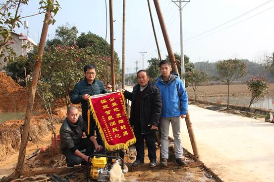2016年11月,武汉地调中心承担的“长江中游城市群咸宁-岳阳和南昌-怀化段高铁沿线1∶5万环境地质调查”项目,在开展汀泗桥幅1∶5万环境地质调查期间了解到当地群众对安全用水的迫切需求,主动联系村委会,结合已有的实地调查、物探和当地地质条件等资料,在该小组集中居住地部署了一个探采结合水文地质钻孔,并组织力量抓紧实施。2017年1月5日,该井完成钻探施工,成井深度101米,单井涌水量超过250吨/天,完全满足了该小组群众的用水需求,彻底解决了困扰当地群众用水的难题。