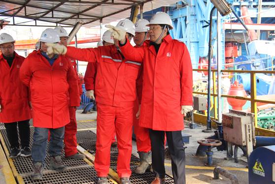 在地调局油气资源中心组织实施的鄂宜参1井现场,胡茂焱一行看望慰问了项目组和中原油田钻井施工一线人员,向他们赠送了水果等慰问品,参观了井场标准化建设,查看了钻井岩芯,为他们送上了春节祝福。