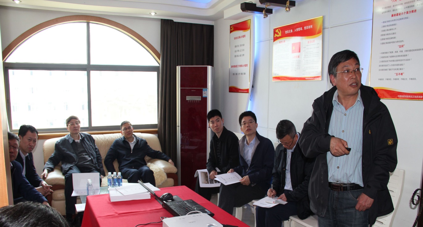 王昆副局长一行首先前往宜都市聂家河镇肖家岗村,考察了鄂宜地4井施工现场,项目组周鹏工程师向调研组介绍了鄂宜地4井的钻探目的、部署依据、工程进展和安全生产等相关情况。随后,调研组在宜都项目部驻地召开了座谈会,项目负责人王传尚研究员向调研组汇报了中扬子地区古生界页岩气基础地质调查项目2016年工作进展和成果认识。王昆副局长充分肯定了“中扬子地区古生界页岩气基础地质调查”项目所取得的成果,并要求项目组抓紧总结相关的成果资料,以专报的形式上报中国地质调查局。