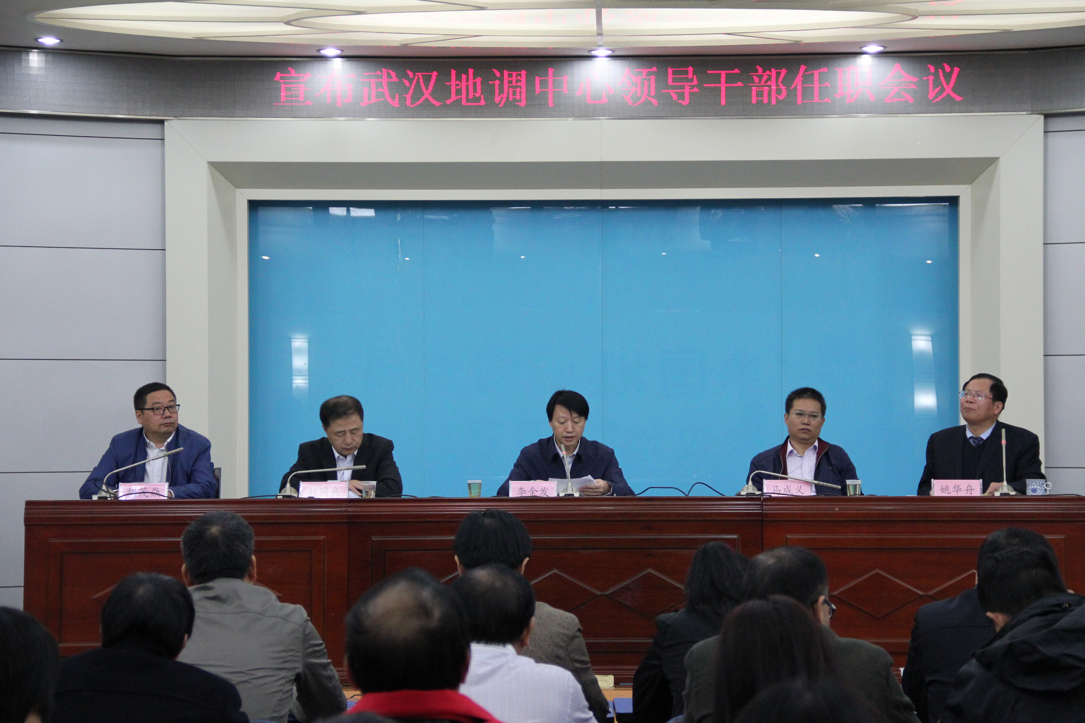 2017年10月20日上午,地调局武汉地质调查中心召开领导干部任职会议。中国地质调查局党组成员、副局长李金发出席会议并讲话,地调局人事教育部副主任马成义、人事教育部二处处长赵霞出席会议,武汉地调中心领导班子成员、中层干部、高级职称以上专业技术人员及在汉职工共140余人参加了会议。