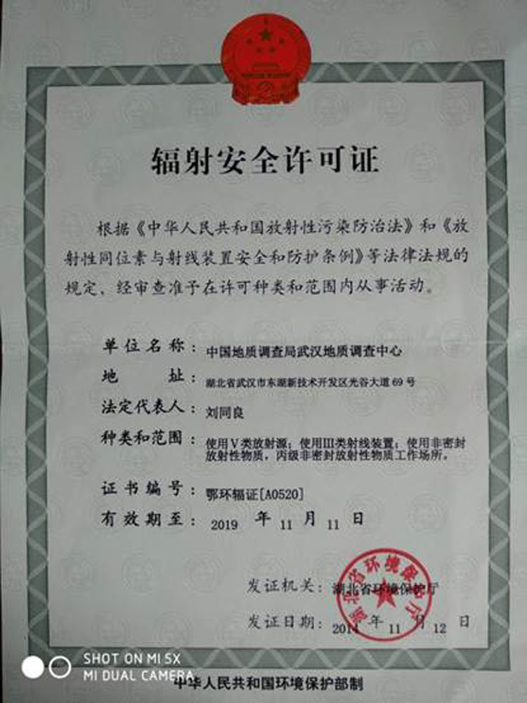 为顺利通过《辐射安全许可证》增项,实验测试室相关工作人员参加了辐射安全与防护培训班,建立了工作人员的个人剂量档案和职业健康监护档案,工作场所添加了铅防护服、辐射剂量监测仪等环保防护设施,并在湖北省环境保护厅网站上进行了建设项目环境影响登记等工作。此次增项申请通过,标志着武汉地质调查中心被审查准予从事检测活动的种类和范围进一步扩大。