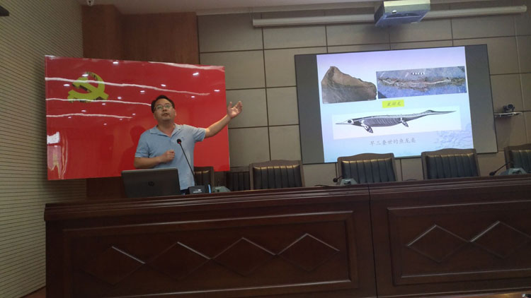 程龙博士以“华南三叠纪海生恐龙”为题,深入浅出地揭示了南漳龙发现的科学意义,详细解读了海龙的演化序列,并就地质公园的建设和地质旅游服务提出了具体建议。报告形象生动、精彩纷呈,得到南漳县负责地质公园规划管理工作有关同志的高度赞扬,并于会后与程龙博士就有关问题进行了深入讨论和交流。