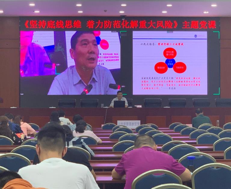 中心党委书记郭兴华以《坚持底线思维,着力防范化解重大风险》为题,分享了学习《习近平谈治国理政》第三卷的体会,带领广大干部职工深入学习了习近平总书记关于坚持底线思维、着力防范化解重大风险有关论述。分析研判了国内外政治经济形式和环境,深刻剖析了中心在贯彻落实党中央关于地质工作的部署、全面从严治党战略部署、新时代党的组织路线及巡视、内部审计等发现问题整改方面存在的问题,并从坚持底线思维的角度提出了解决问题的思路与举措。党课思路清晰、内涵丰富、紧贴实际、措施具体。特别是注重用详实的数据、丰富的案例,深入浅出、通俗易懂、寓理于“时”,达到了“入脑、入心、入行”的目的。