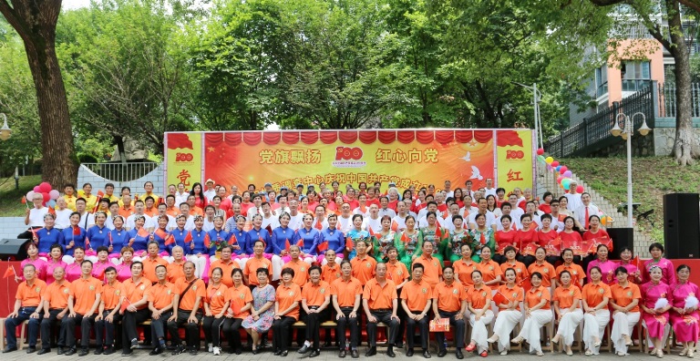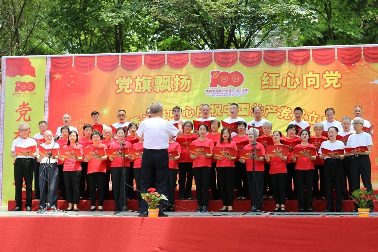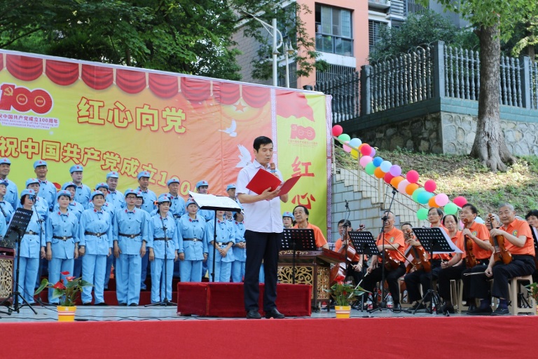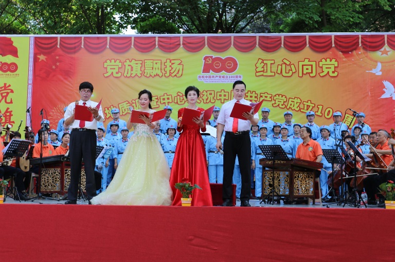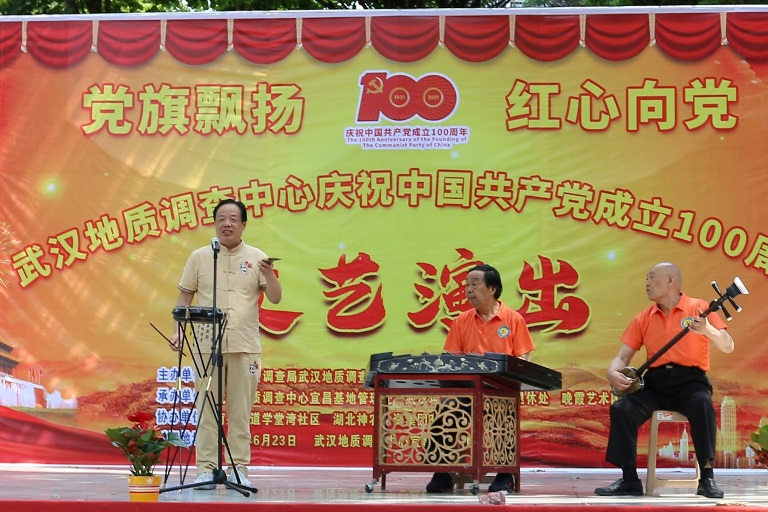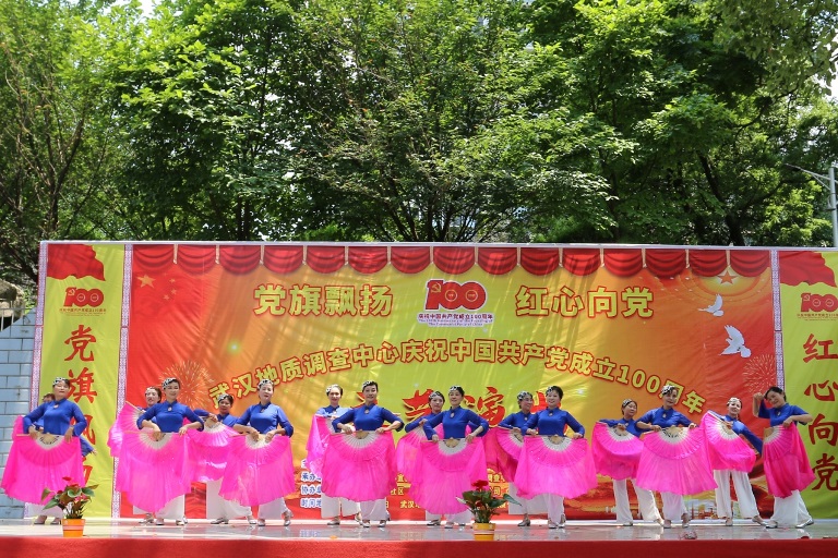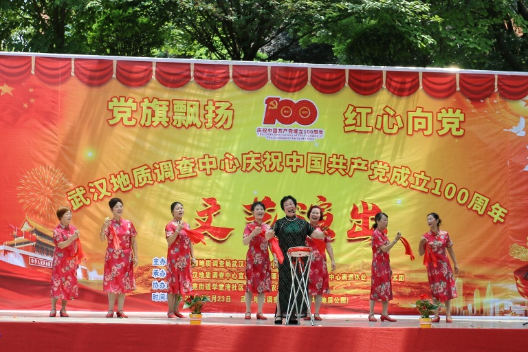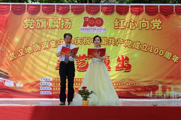 2021年6月23日上午,为庆祝中国共产党百年华诞,中国地质调查局武汉地质调查中心在宜昌基地隆重举办庆祝中国共产党成立100周年文艺演出,演出主题为“党旗飘扬、红心向党”。武汉地调中心党委书记郭兴华、纪委书记曾冶红和南苑街道党工委副书记、街道办主任商龙泉,学堂湾社区党委书记、居委会主任李卫民,宜昌高新区东山派出所警官余丹,湖北神农投资集团有限公司党支部委员、副总经理张敏等出席活动并观看演出。