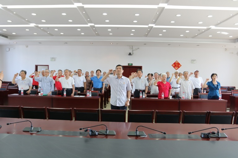 颁发仪式庄严、热烈,党委书记郭兴华带领大家重温入党誓词,纪委书记曾冶红宣读中心荣获“光荣在党50年”的老同志名单,郭兴华同志逐一为到场的18位光荣在党50年的老党员颁发纪念章并合影留念。