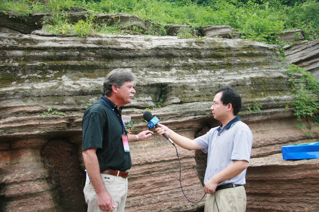 在热烈的掌声中,阮成发首先代表湖北省人民政府致欢迎词,接着,S.芬尼教授宣读国际地科联批准黄花场和王家湾金钉子的批文,汪民副部长发表了热情洋溢的讲话,陈旭院士代表奥陶系分会简要介绍黄花场及王家湾“金钉子”的情况。最后,市长代表当地政府致辞,并感谢为此作出贡献的地质科研人员。在七彩礼花的缤纷中,汪民、阮成发、S.芬尼教授、J.奥格教授、李佑才等共同为“金钉子”揭碑。科技日报、国土资源报、湖北省电视台、湖北日报、宜昌市三峡电视台、宜昌日报、三峡晚报、楚天都市报等媒体全程对揭碑开园仪式进行了拍摄,湖北省电视台现场进行了采访。